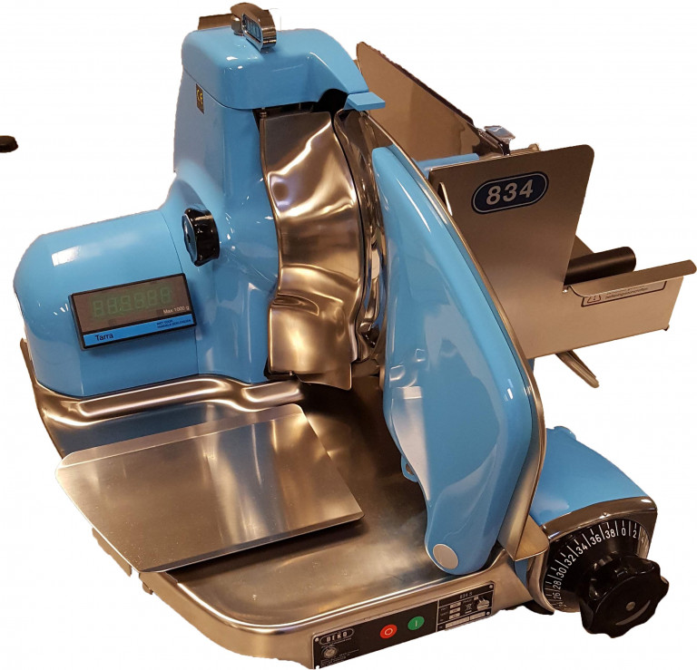 Die legendäre Edelstahl-Präzisions-Schneidemaschine Typ 834 Combi-S mit integrierter Waage garantiert durch mögliche Kontrollwägungen während des Schneidevorgangs das Erreichen des gewünschten Sollgewichtes. Der extrem ruhige Lauf des kräftigen Antriebs in Kombination mit der Präzisions- Feineinstellung gewährleistet das Schneiden hochwertigster Produkte. Der rollengelagerte, abkklapp-und abnehmbare Schlittentisch ermöglicht eine leichte Reinigung. Mit Hilfe des bewährten, integrierten Schleifapparates gelingt das perfekte Schärfen des Messers ohne besondere Fachkenntnisse.