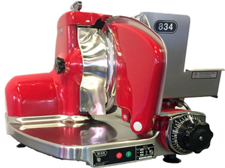 Die bewährte, legendäre fast unschlagbare Edelstahl-Präzisions-Schneidemaschine Typ 834-BR in Berkel-Rot mit extrem ruhigem Lauf, kräftigem Antrieb, rollengelagertem, abkklapp-und abnehmbarem Schlittentisch, spezialverzahntem Brotmesser, Präzisions- Feineinstellung für einen perfekten Schnitt