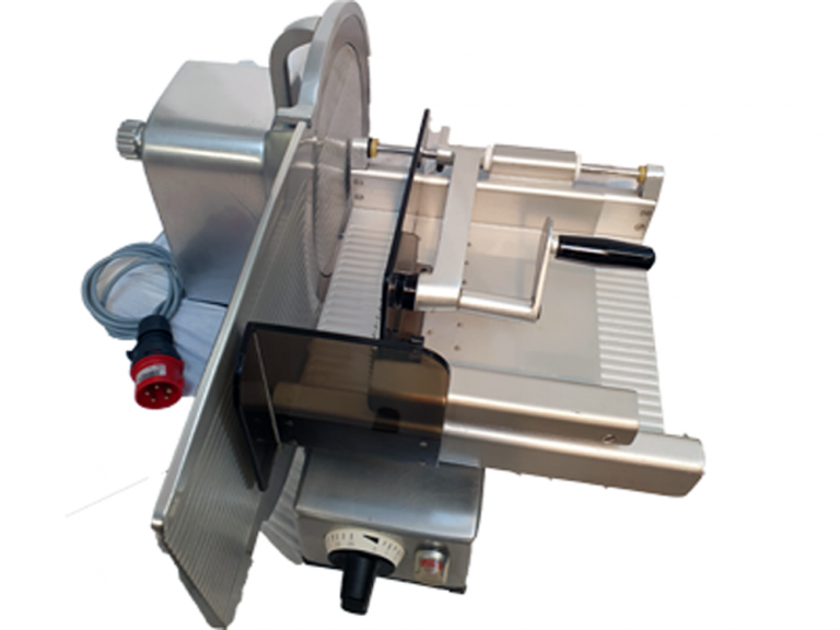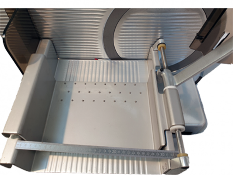 Top instandgesetzte, gebrauchte Spezial- Fleisch- und Rouladen-Schneidemaschine Typ Graef Euro3300 in eloxiertem Aluminium, nahtlos verarbeitet, mit extra großem Schlittentisch für Waren bis zu einer Breite von 30,5 cm, mitlaufende Edelstahl-Fleischwanne herausnehmbar, mit supergeschärften 330mm Gebrauchtmesser, abnehmbarer Schlittentisch