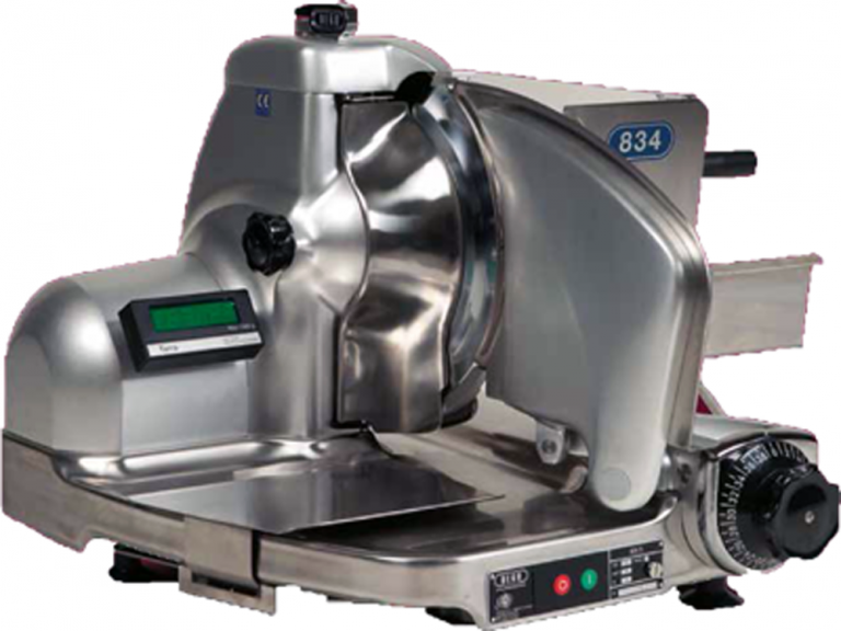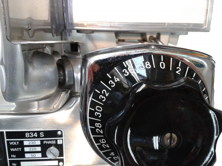 Die bewährte, legendäre fast unschlagbare Edelstahl-Präzisions-Schneidemaschine Typ 834-S mit extrem ruhigem Lauf, kräftigem Antrieb, rollengelagertem, abkklapp-und abnehmbarem Schlittentisch, integriertem Schleifapparat, Präzisions- Feineinstellung für das Schneiden hochwertigster Produkte