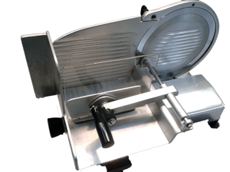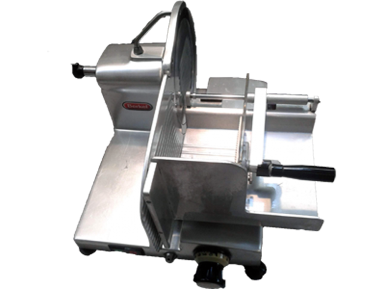 Instandgesetzte, gebrauchte Schneidemaschine Typ Berkel SM300S in nahtlos verarbeitetem, eloxiertem Aluminium, leider mit Gebrauchsspuren, aber in technisch gutem Zustand, Senkrechtschneider mit abnehmbarem Schlittentisch und kräftigem Direktantrieb des Messers