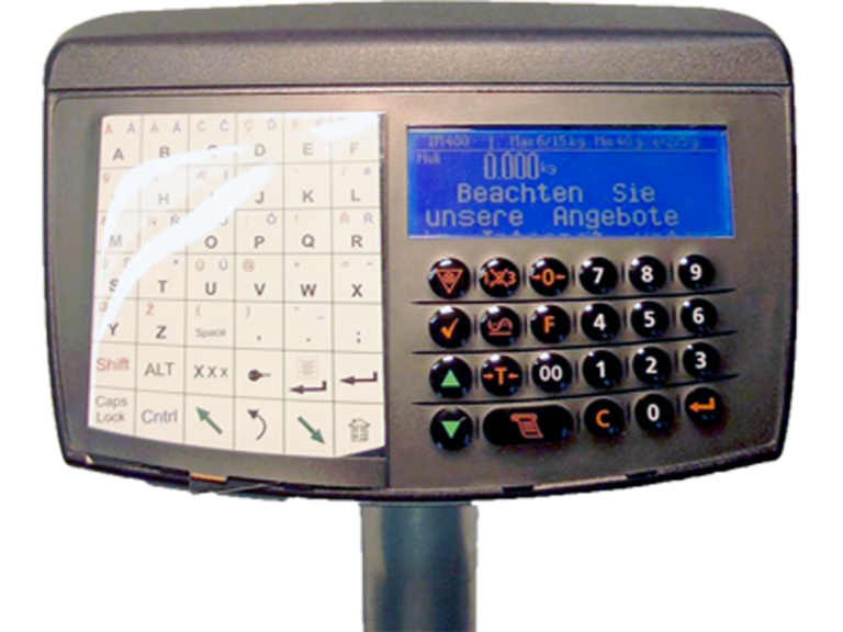 Gebrauchte Multifunktionswaage Typ AveryBerkel IM400 in gutem Zustand, mit einem grafikfähigem Thermodrucker für Etiketten und Additionsbon ausgestattet. Zur besseren Bedienbarkeit sind die Tastatur und das beidseitige Alphadisplay obenliegend; Datenpflege mit lizenzierter PC-Software möglich; Als Auzeichnungsgerät für die Vorverpackung mit Klebeetiketten oder als druckende Kontrollwaage für bestimmte Zwecke einsetztbar
