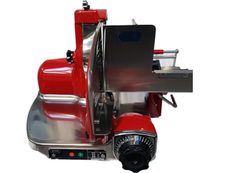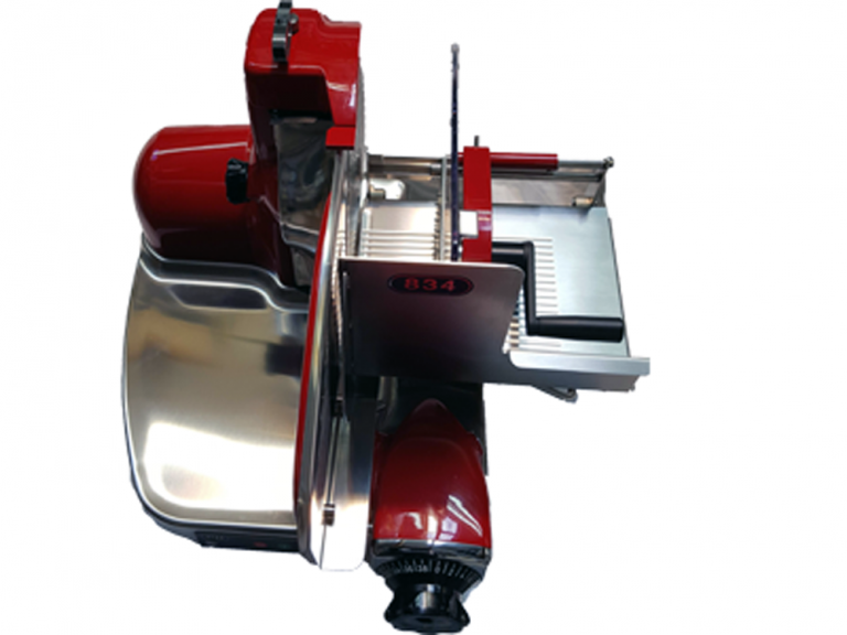 Legendäre Edelstahl-Präzisions-Schneidemaschine Typ Berkel Deko 834S, gebaucht in werksmäßig neuwertig aufgebautem Zustand, neu lackiert in Ral 3003 rot, extrem ruhiger Lauf, kräftiger Antrieb, rollengelagerter, abkklapp-und abnehmbarer Schlittentisch, integrierter Schleifapparat, Präzisions- Feineinstellung für exakten Schnitt, von einer Neuen nur durch die leichten Kratzspuren der Edelstahlteile zu unterscheiden, viele Neuteile, Lieferzeit 4 Wochen