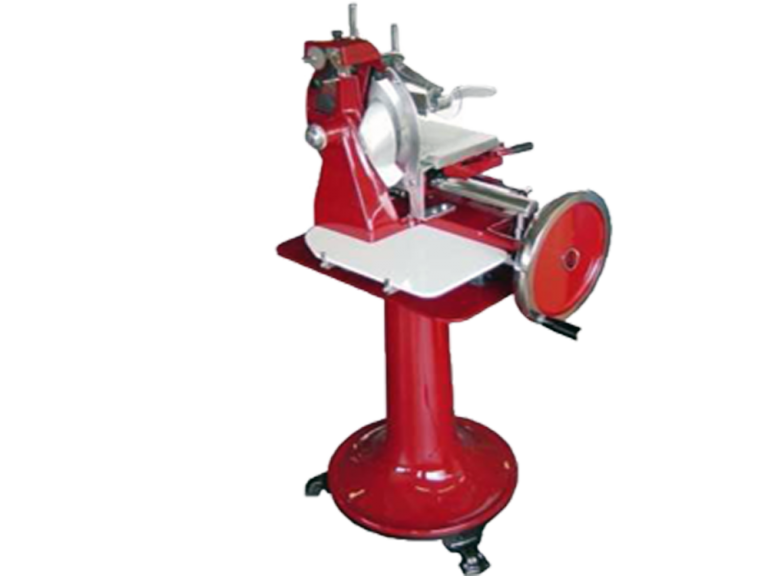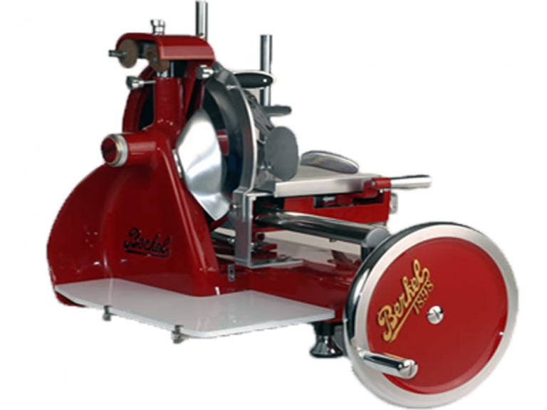 Neue, manuelle, mechanische Schwungrad-Schneidemaschine Typ Berkel B3 nach historischem Vorbild des legendären Van Berkels Patent in rot oder schwarz lackiert, mit Blumenschwungrad, besonders zum Schneiden von Prosciutto, Serano und anderen hochwertigen Schinken- und Wurstprodukten mit einer Einlegegröße von maximal 21 x 27 cm geeignet, mit integriertem Schleifapparat, hochwertige Verarbeitung