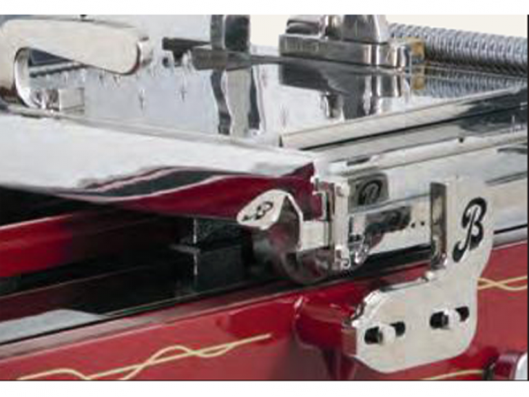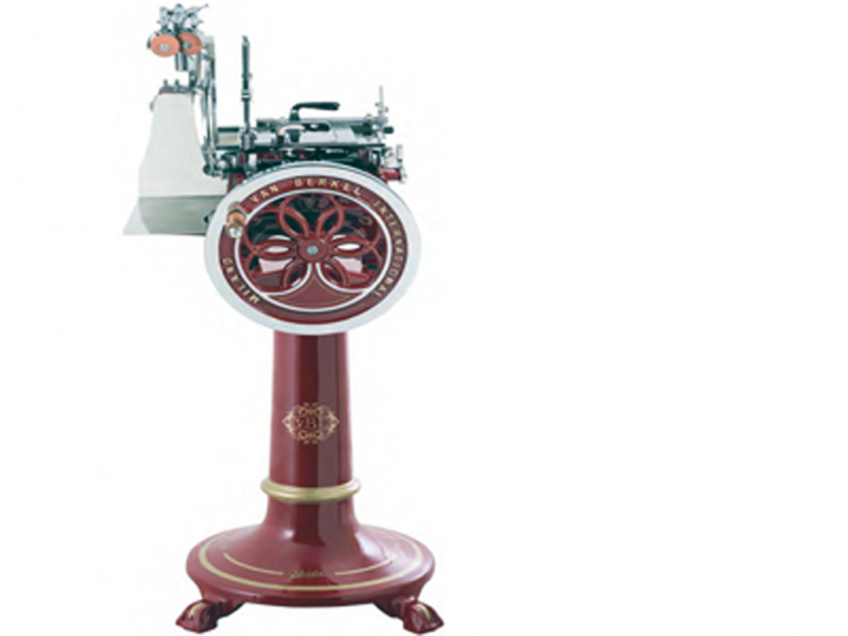 Typ Berkel L16 mit 350 mm Messer, neue Reproduktion des legendären Van Berkel Modells L in historischem Berkel-Rot mit goldenen Verzierungen, besonders zum Schneiden von Prosciutto, Serano oder anderen hochwertigen Schinken- und Wurstprodukten mit einer Maximalgröße von 200 x 260 mm geeignet, mit verchromtem Schleifapparat und verchromtem Typenschild, hochwertigste Verarbeitungskunst